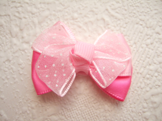 Lieve 2-kleurige strikjes van fuchsia en roze satijnband, met erop een organza polkadots strikje.