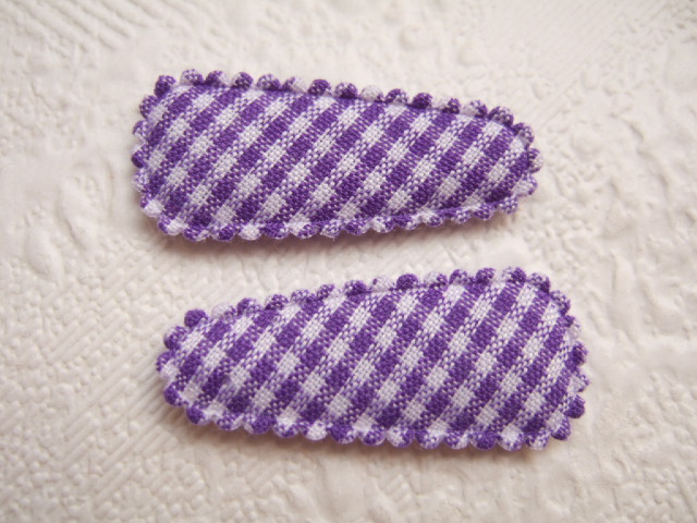 Paars-wit geruite kniphoesjes met een schuin ruitje, voor 3 cm haarknipjes.