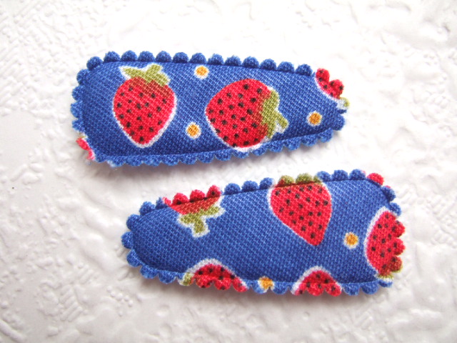 Blauw bedrukt met rode aardbeitjes.