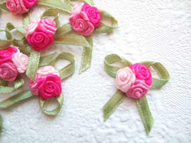 Schattige 3-dubbele satijnen roosjes op groene satijnen strikjes.