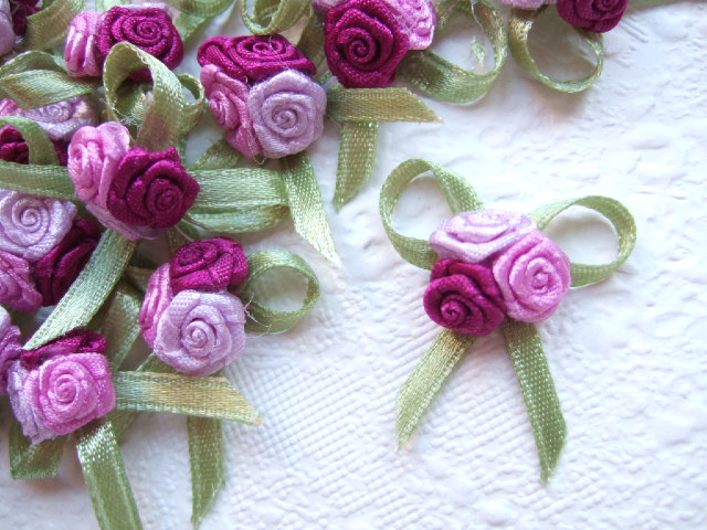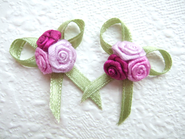 Schattige 3-dubbele satijnen roosjes op groene satijnen strikjes.