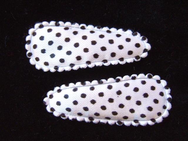Wit satijnen polkadots kniphoesjes met zwarte stippen, voor 4 cm haarknipjes.