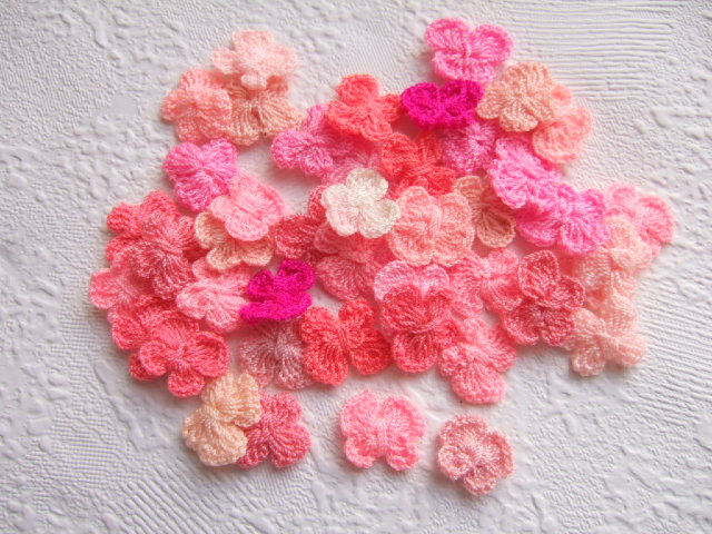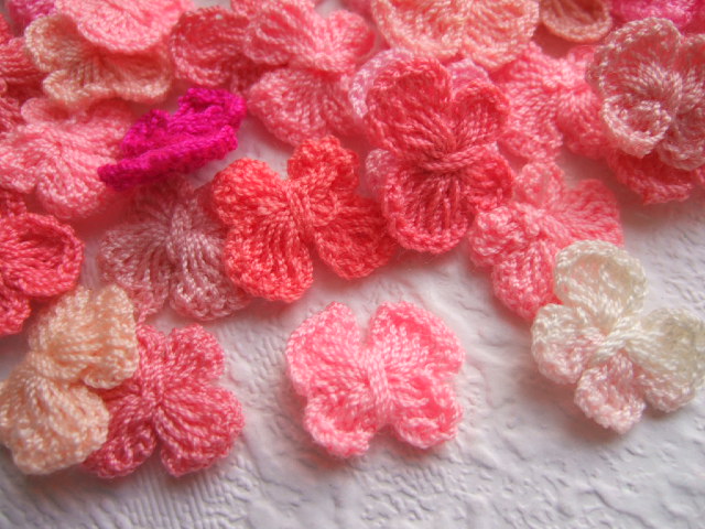Partijtje van 45 kleine gehaakte vlindertjes in verschillende tinten roze.