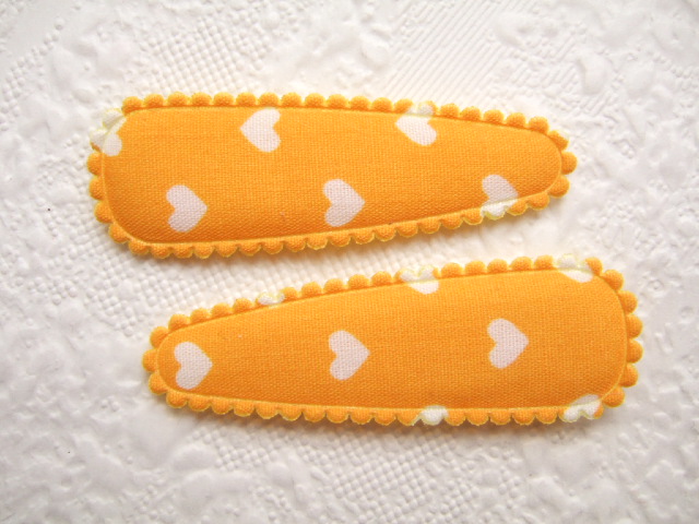 Gele katoenen kniphoesjes bedrukt met witte hartjes.