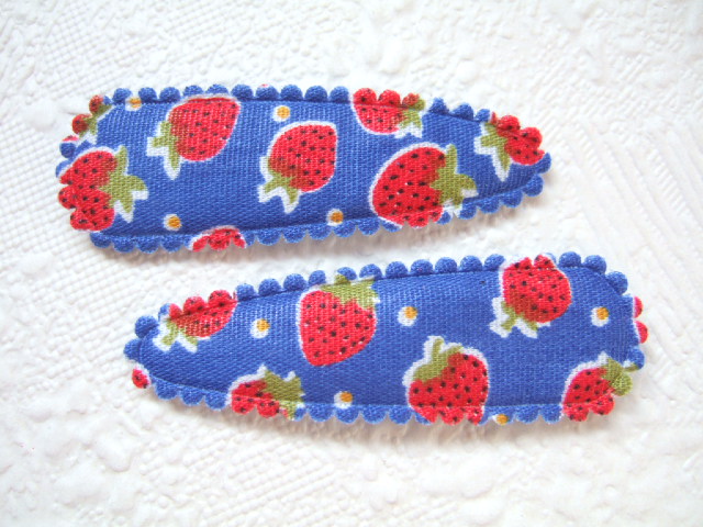 Blauwe katoenen kniphoesjes bedrukt met rode aardbeitjes.