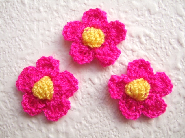 Fuchsia roze gehaakte bloemetjes met een eigeel hartje.