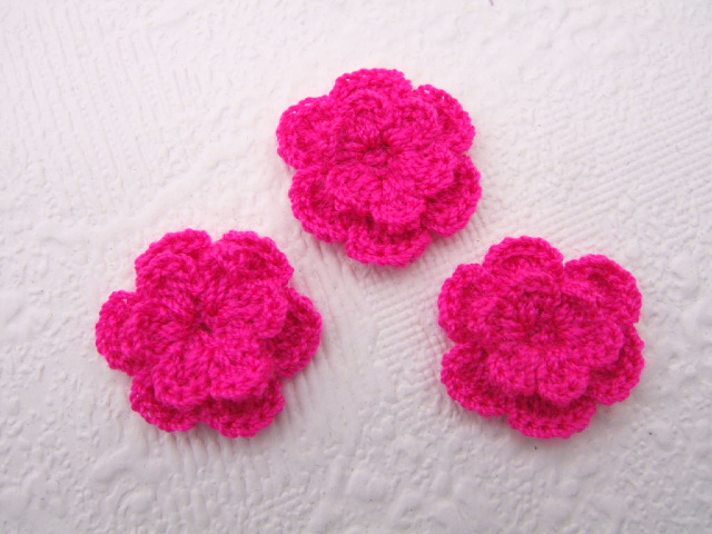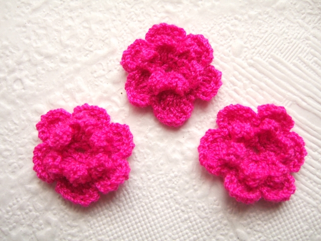 Fuchsia roze dubbele gehaakte bloemetjes.