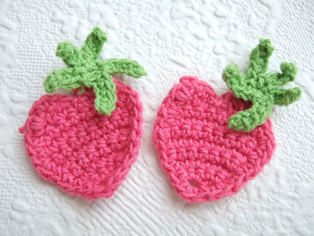 Gehaakte fuchsia roze aardbeitjes met groene blaadjes.