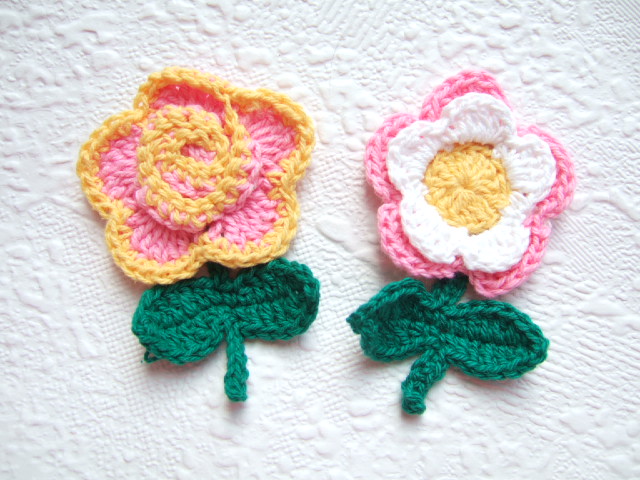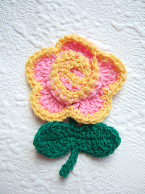 Mooie gehaakte bloemen in warm roze en geel, met een donker groen steeltje en blaadjes.