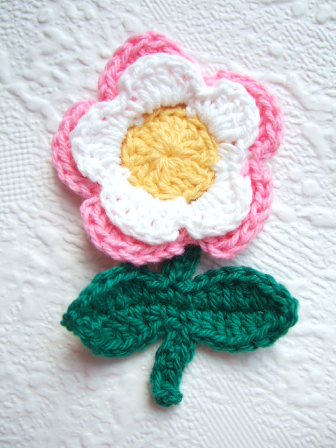 Mooie gehaakte bloemen in warm roze, wit en geel, met een donker groen steeltje en blaadjes.