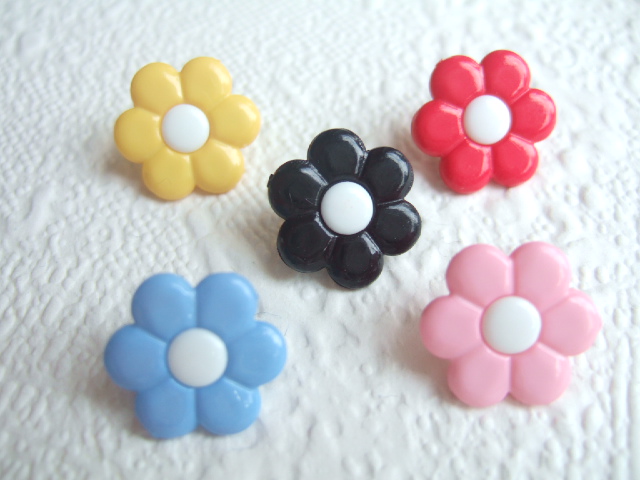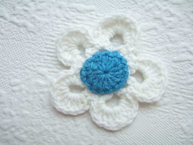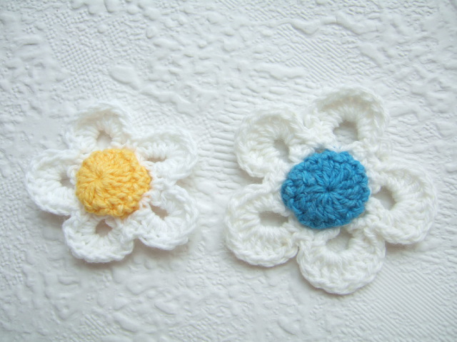 Mooie frisse gehaakte bloemen, warm wit met een blauw hartje.
