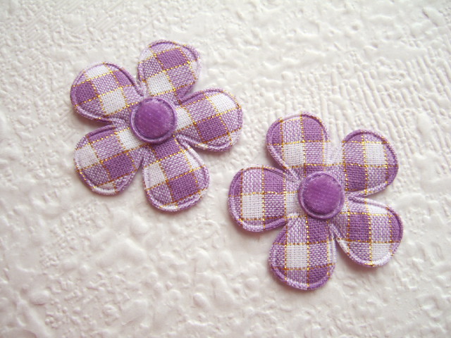Paars / wit geruite bloemen met een goud draadje erdoor.