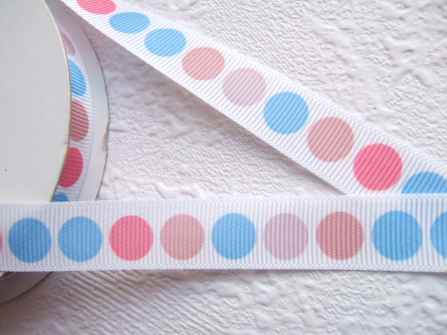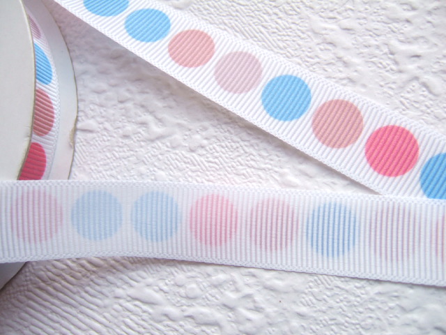Wit grosgrain band bedrukt met grote stippen in blauw en roze tinten.