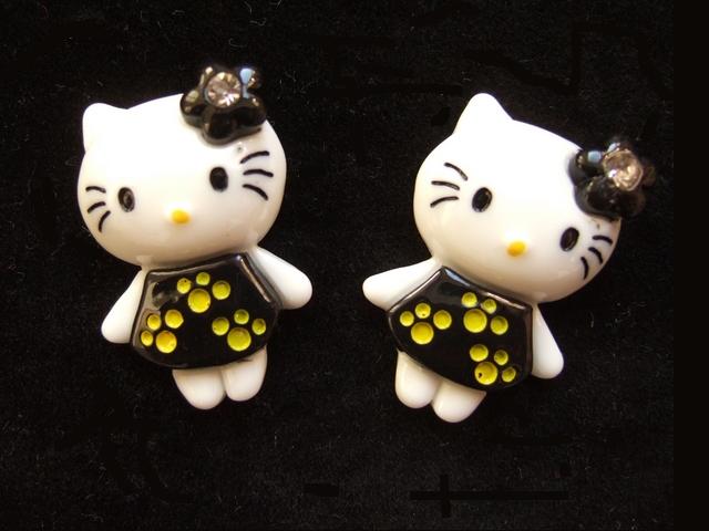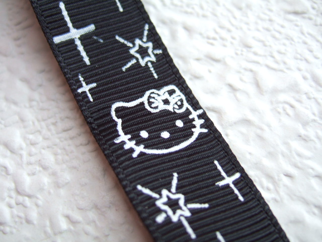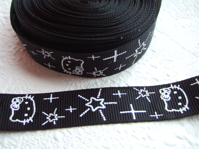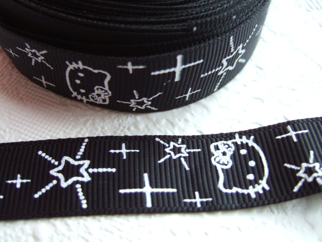 Nieuw zwart grosgrain band bedrukt met witte Hello Kitty & sterretjes.