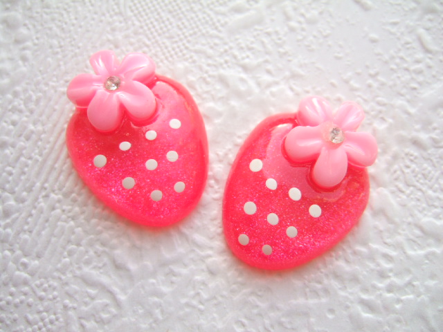 Leuke aardbeien flatbacks, van doorzichtige kunststof met daarachter wat glinster.