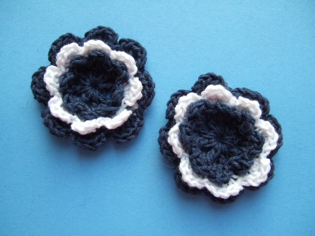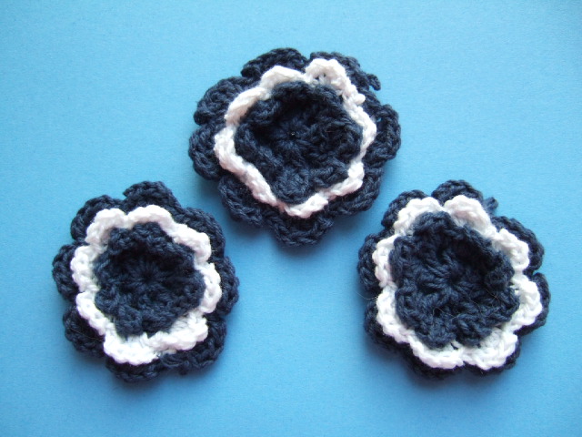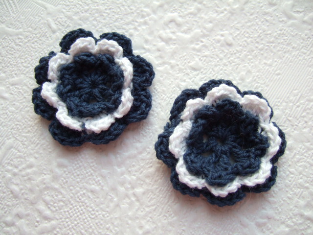 Gehaakte bloemen met 3 randjes, in donker blauw en helder wit.