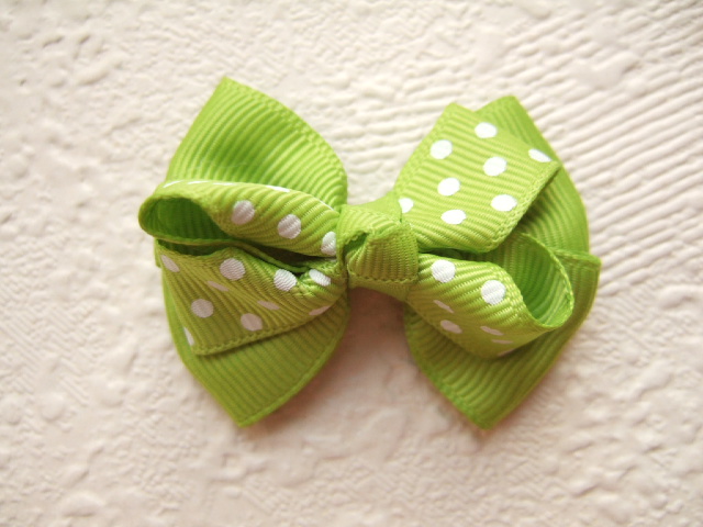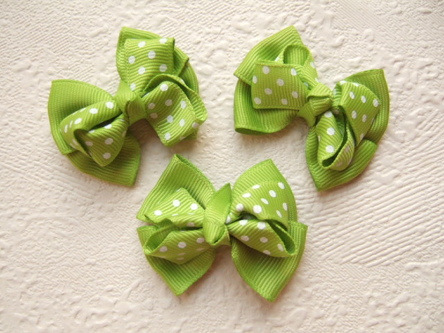 Mooie grote 3D strikken van effen groen grosgrain band en band met witte stippen.