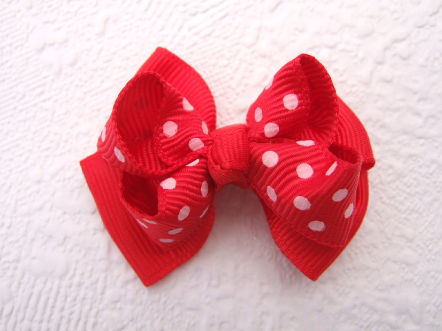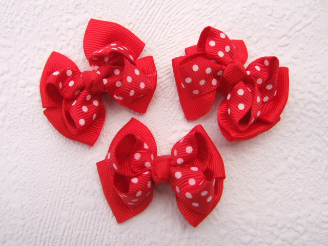 Mooie grote 3D strikken van effen rood grosgrain band en band met witte stippen.