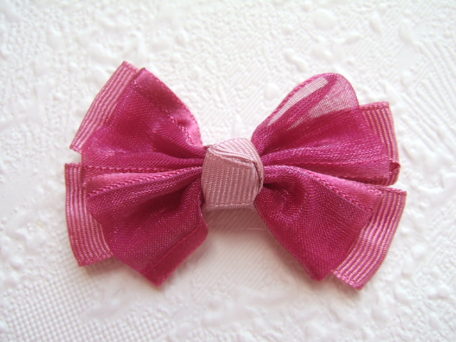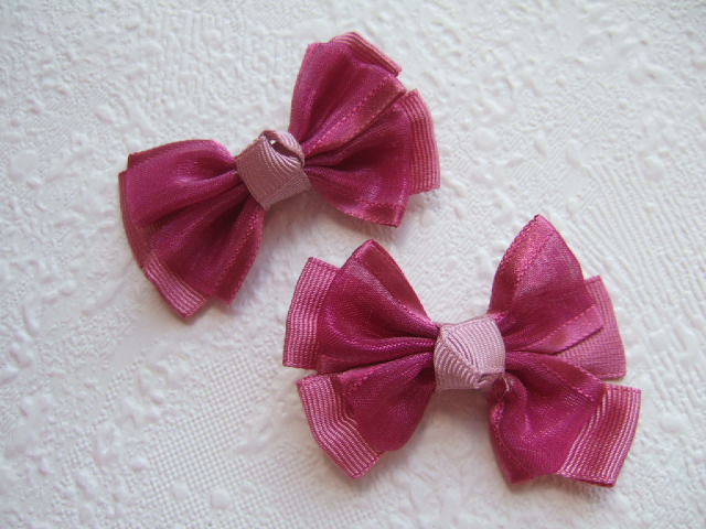 Grote vlinder strikjes van oud roze / mauve grosgrain band met daarop een strikje van organza met een satijnen randje.