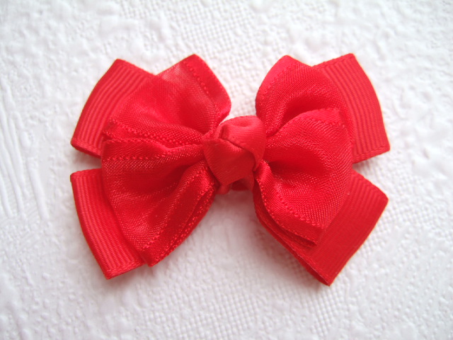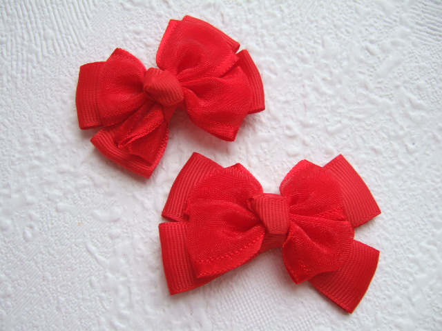 Grote vlinder strikjes van rood grosgrain band met daarop een strikje van organza met een satijnen randje.