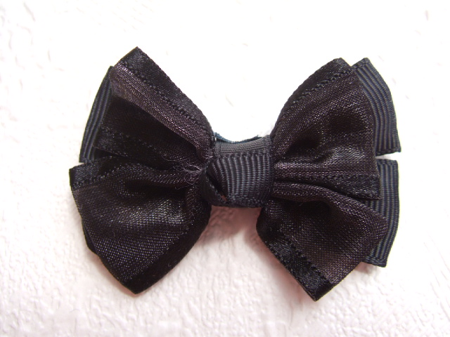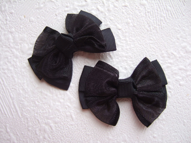 Grote vlinder strikjes van zwart grosgrain band met daarop een strikje van organza met een satijnen randje.