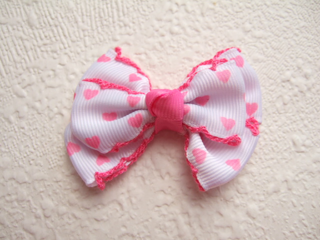 Grote vlinder strikken van grosgrain band, bedrukt met roze hartjes.