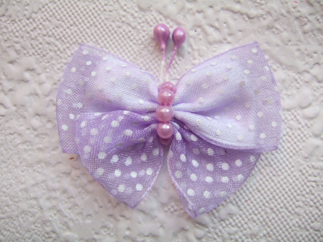 De vleugels zijn dubbel, van grosgrain band en organza polkadot band.