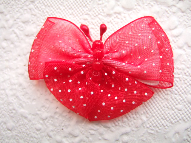 De vleugels zijn dubbel, van grosgrain band en organza polkadot band.