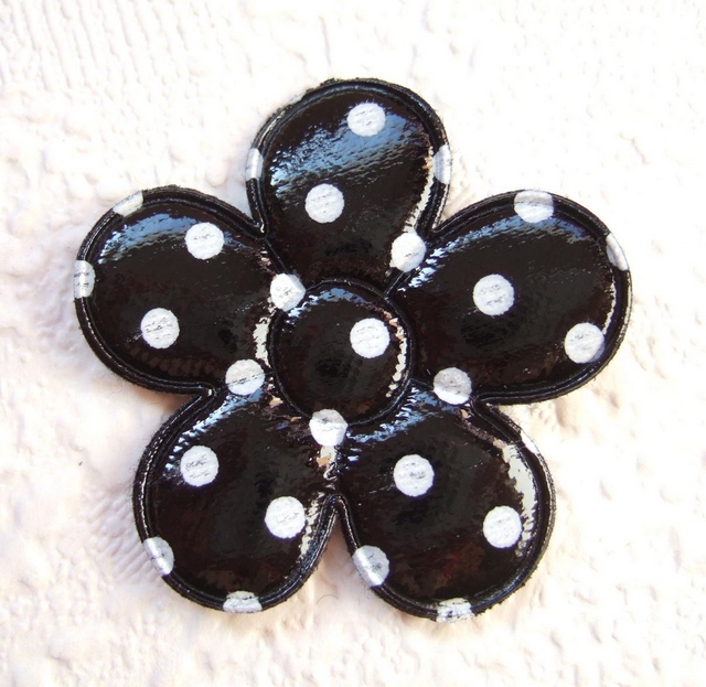 Grote gevulde zwarte bloemen met witte stippen.