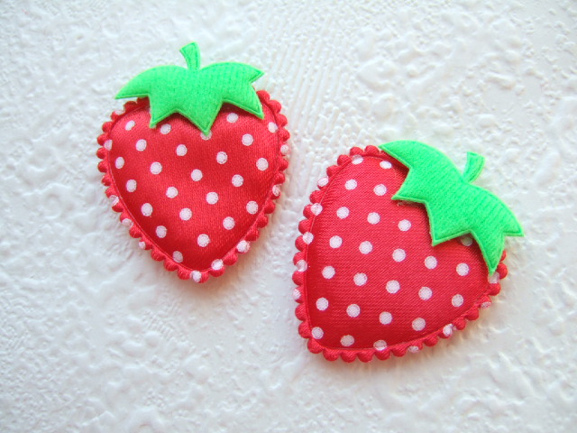 Mooie, iets gevulde satijnen aardbeien, met witte stippen.
