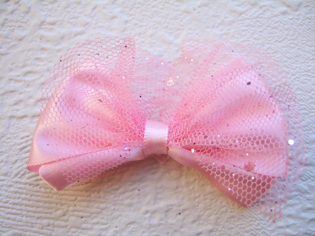 Grote satijnen strik met daarop een laag iets glinsterende tule.