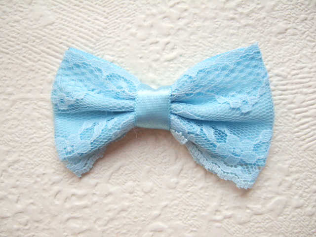 Grote strikken van breed satijnband, bedekt met fijn kant in dezelfde kleur.