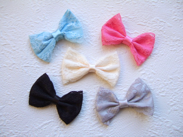 Grote strikken van breed satijnband, bedekt met fijn kant in dezelfde kleur.