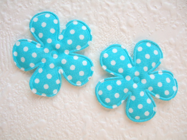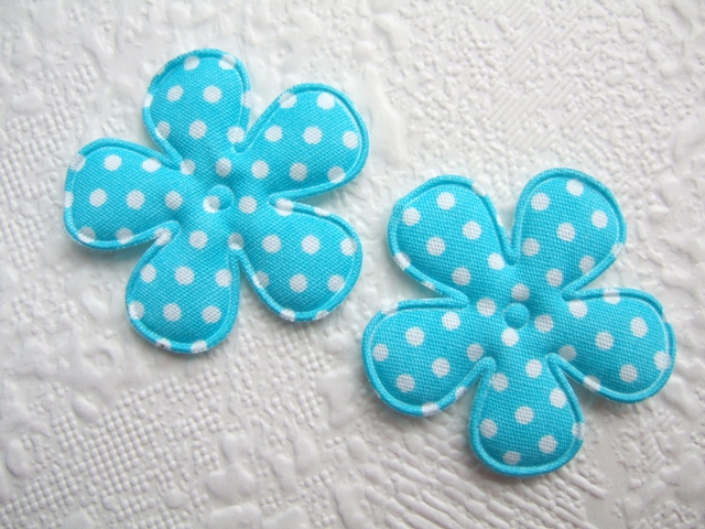 Gevulde bloemen van katoen, aqua blauw met witte polkadots.