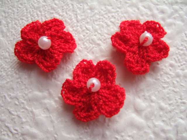 Kleine rode gehaakte bloemetjes, met een klein parel kraaltje erop.