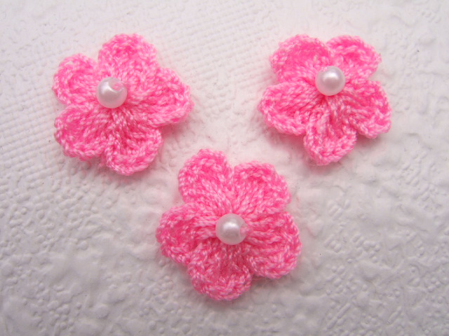 Kleine roze gehaakte bloemetjes, met een klein parel kraaltje erop.