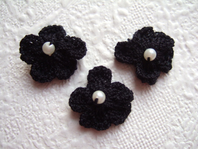 Kleine zwarte gehaakte bloemetjes, met een klein parel kraaltje erop.