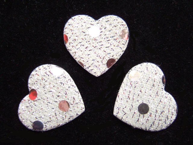 Mooi met zilverdraad bewerkte witte hartjes, bezet met zilveren lovertjes.