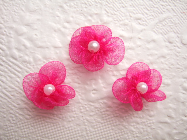 Lieve fuchsia roze organza bloemetjes met klein parel kraaltje.