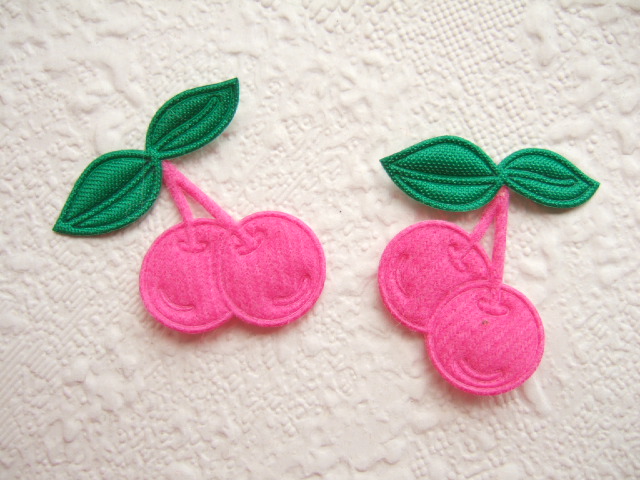 Iets gevulde kersen van kunst vilt met groene satijnen blaadjes.