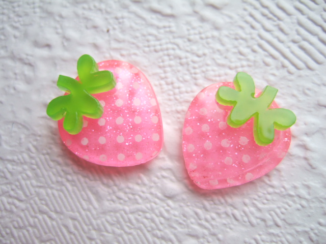 Leuke roze aardbeien flatbacks met iets glinster erin en een frisgroen kroontje.