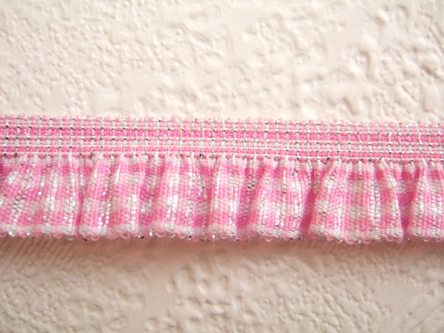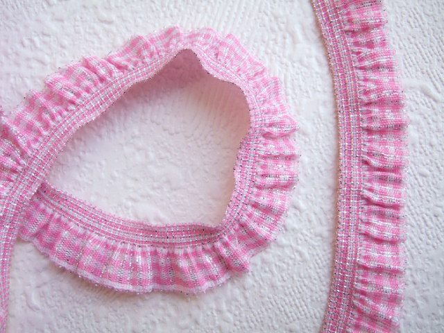 Mooi gerimpeld band met roze-witte ruitjes.