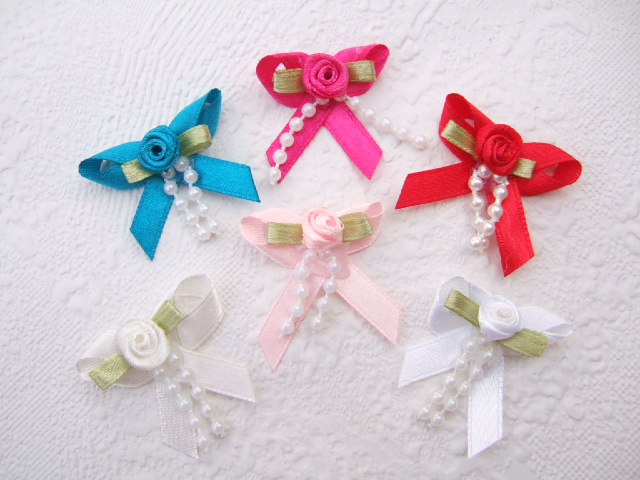 Schattige blauwe satijnen strikjes met kraaltje en een roosje erop.