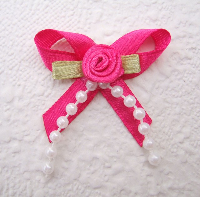 Schattige fuchsia roze satijnen strikjes met kraaltje en een roosje erop.