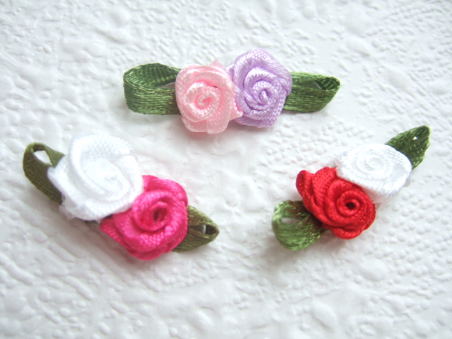 Lieve dubbele satijnen roosjes op groene blaadjes.