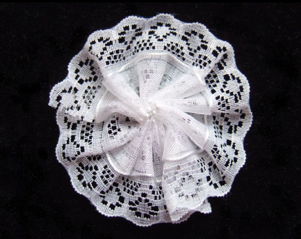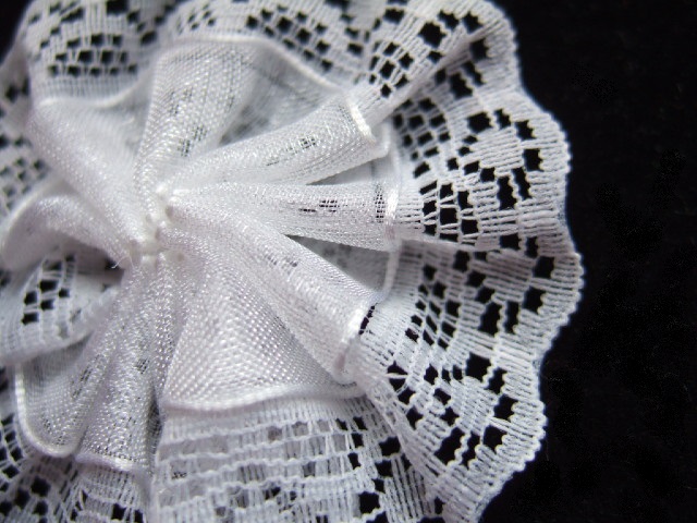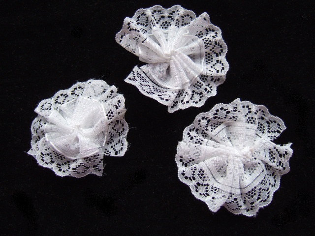 Lieve dubbele rozetjes van fijn wit kant, met daarop een laag organza.