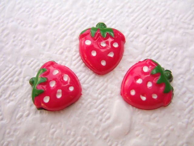 Kleine aardbeien flatbacks, fuchsia roze met witte stipjes en een groen kroontje.