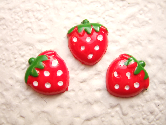 Kleine aardbeien flatbacks, rood met witte stipjes en een groen kroontje.