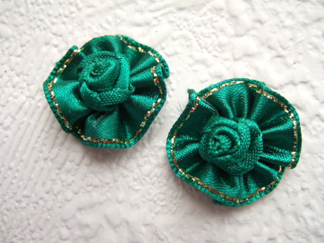 Mooie donker groene rozetjes met een “gouden” randje erlangs, met daarop een groen satijnen roosje.