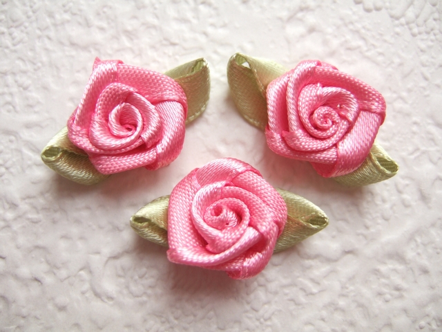Prachtige zacht roze satijnen roosjes met groene blaadjes.